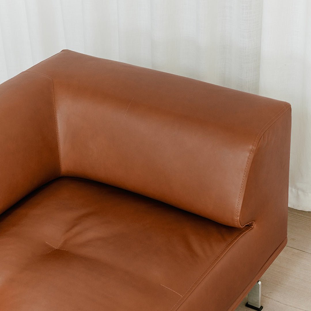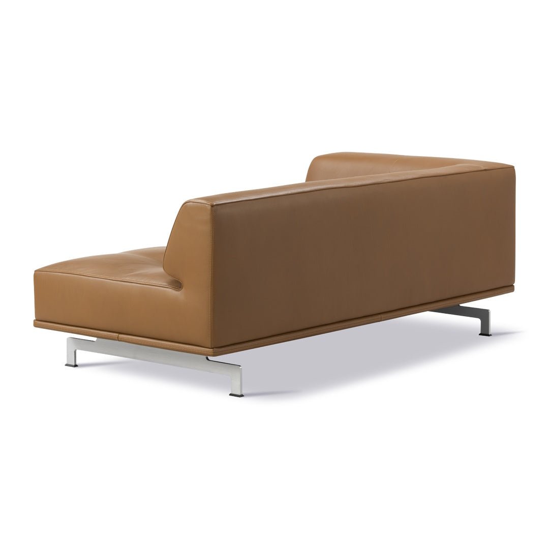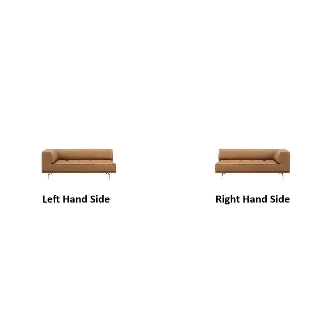 Inner frame of wood, cold cured foam and foam duvet. Available in fabric or leather. Aluminum or solid wood base. Can be used as part of modular configuration. Modules can be independently rearranged.