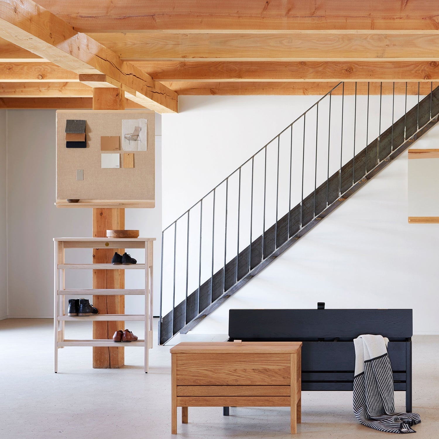 "The aim with this shoe rack was to design a furniture that can store enough shoes without taking up too much space. At the same time our wish was to utilize the height of the shoe rack for a functional shelf." - Herman Studio