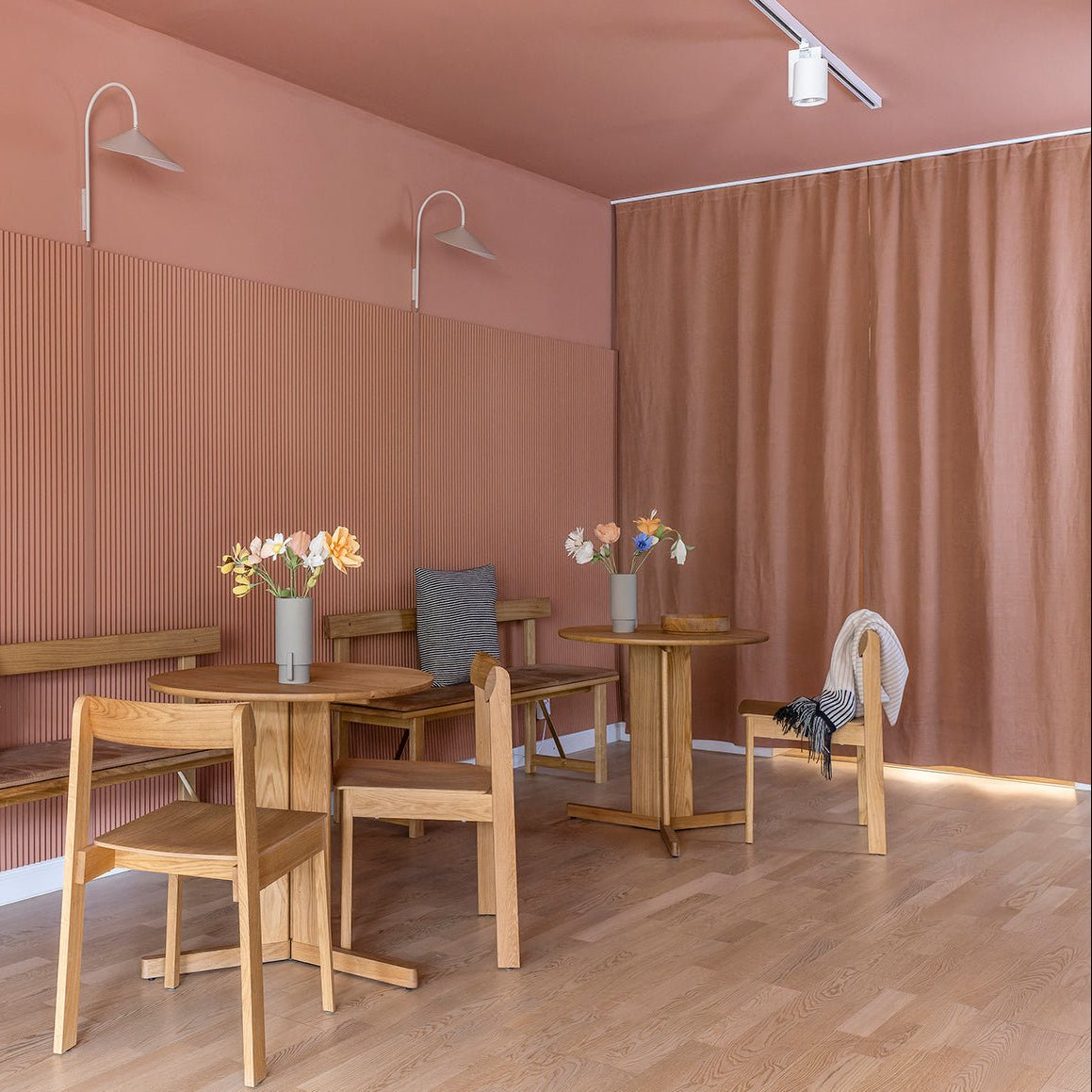 A center point of free-floating solid oak elements holds the round table and creates a contradiction of lightness and a substantially dense round table. The free space of the three legs adds to the lightness and special visual complexity of the table. The three legs make it possible to sit around the table without anyone getting into a conflict with their legs. The table is made to fit all desires – hospitality, office..