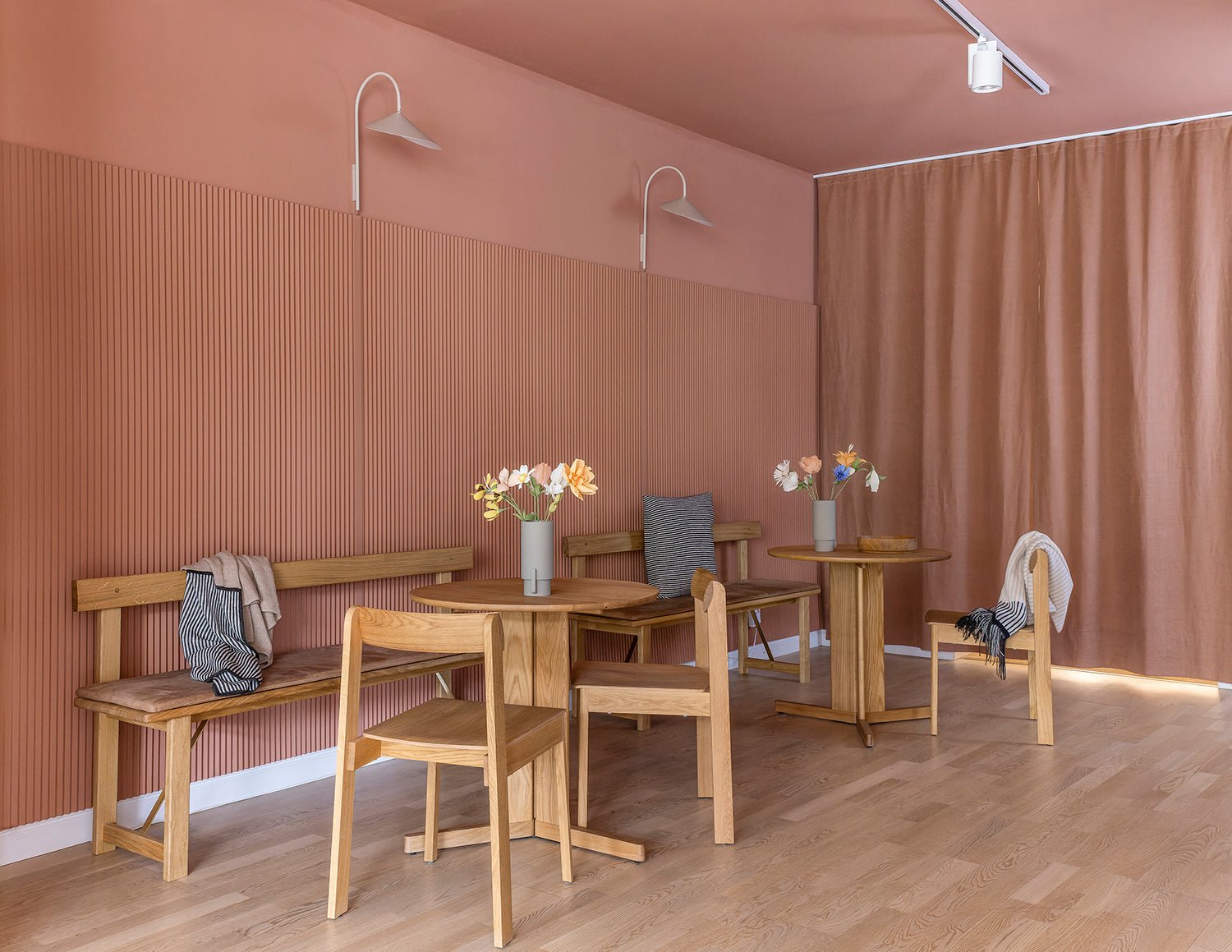 A center point of free-floating solid oak elements holds the round table and creates a contradiction of lightness and a substantially dense round table. The free space of the three legs adds to the lightness and special visual complexity of the table. The three legs make it possible to sit around the table without anyone getting into a conflict with their legs. The table is made to fit all desires – hospitality, office..