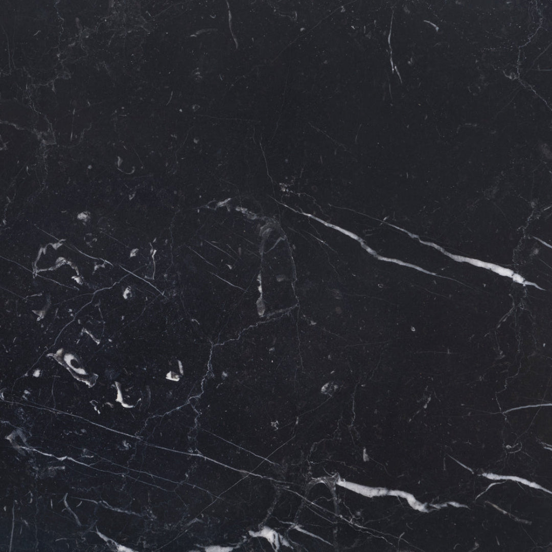 This is a black marble with white veins and a matte surface. The proportion and thickness of the veins can vary considerably from stone to stone. The surface is saturated and treated with stone oil.