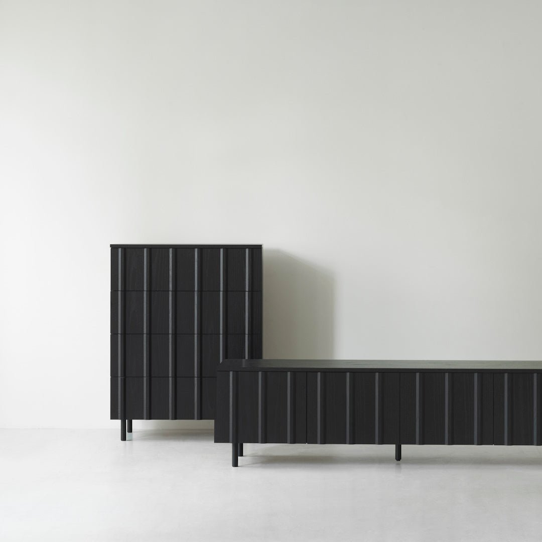 Elevate your storage with the Rib Dresser, available in lacquered or painted oak veneer. The design features 4 spacious drawers and unique trapeze-shaped solid oak slats, enhancing the appearance and adding depth to your space. Complete your look with the matching cabinet and sideboards.