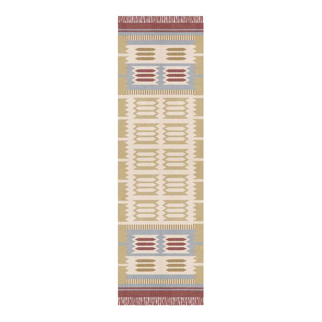 This product is part of Layered's Röllakan collection, which combines modern design with traditional Scandinavian female craftsmanship.Inspired by the traditional röllakan rug, which has played an important role in Scandinavian folk tradition for over 1,000 years, the collection presents five unique rugs in a monochrome color palette and geometric patterns. The rug ‘Hilma’ comes in the colors Fern, Marigold, and Meadow, and the rug ‘Iris’ in the colors Petrol and Raspberry. Like traditional röllakan rugs, these rugs are handwoven, with a vertical warp of 100% cotton and a horizontal weft of 100% wool. The rugs presented in the Röllakan collection are designed to fit in all types of rooms and is particularly suitable for kitchens and dining rooms due to its easy-care properties.