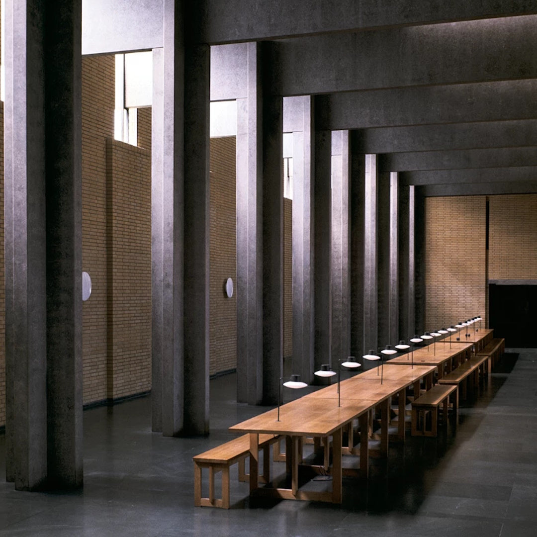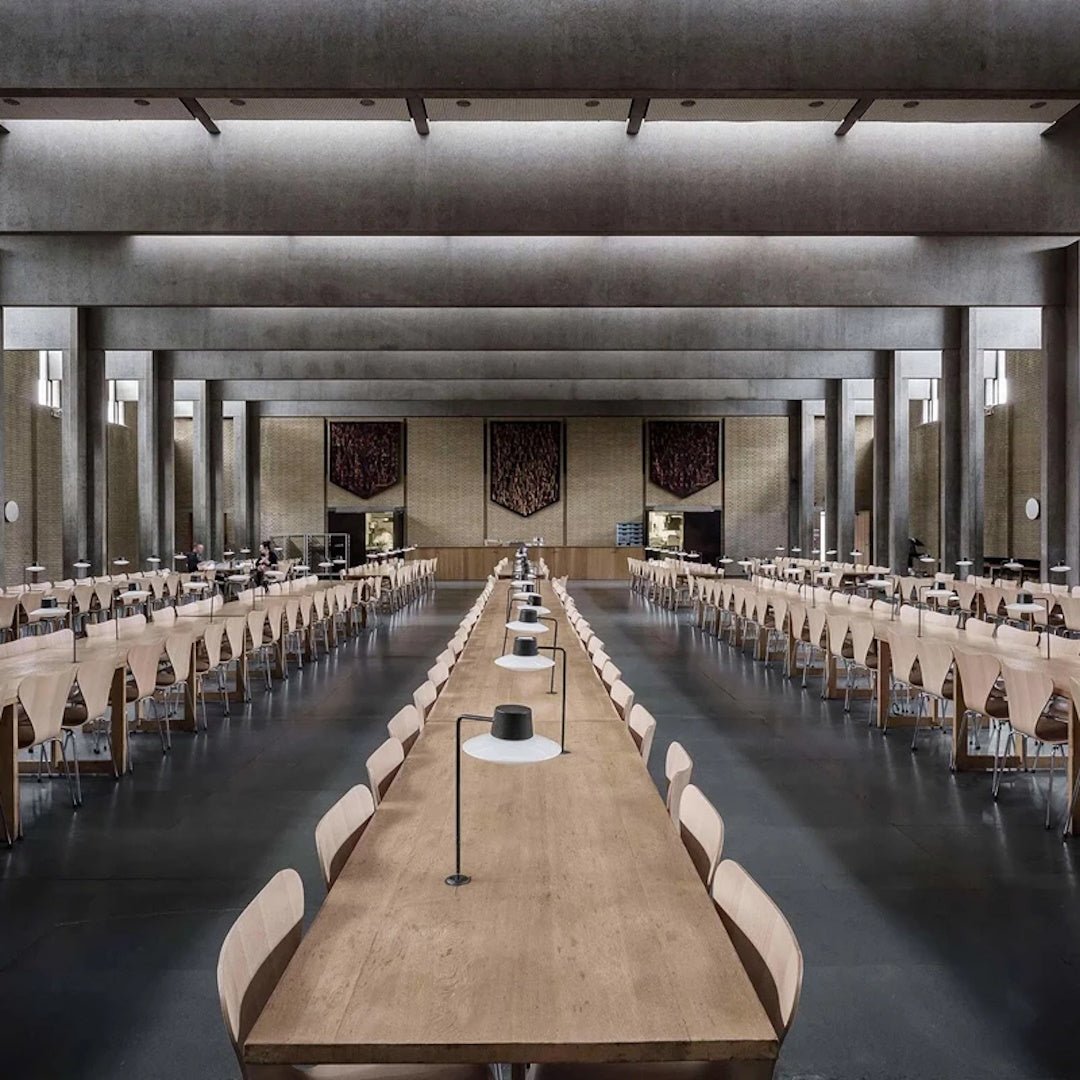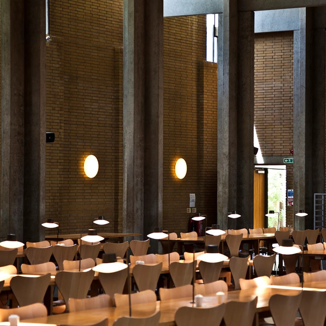 The AJ Oxford Table Lamp's sleek graphic design is inspired by the modernist architecture of St Catherine's College in Oxford. Originally created as a table pin lamp for the college's grand dining hall, this centerpiece provides focused lighting, while the surrounding AJ Eklipta fixtures diffuse natural light for a harmonious and functional atmosphere.