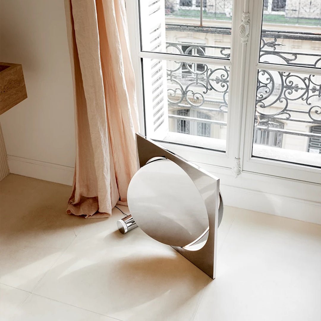 The sculptural floor lamp in chrome-plated aluminum has a rotating disc that allows customization of the reflection of the glare-free light emitted by the LED light source elegantly submerged in the frame. The disc rotates 360° around its own axis and is white on one side and reflective on the other. Tilted towards the white side, the light becomes soft and diffuse, whereas the opposite chrome side reflects the light panel directly for a completely different expression. The light is directed according to the position of the disc. The surroundings are mirrored in the frame and the chrome side of the disc. The lamp offers stepless dimming and is turned on and off by rotating the dial on the cylinder.