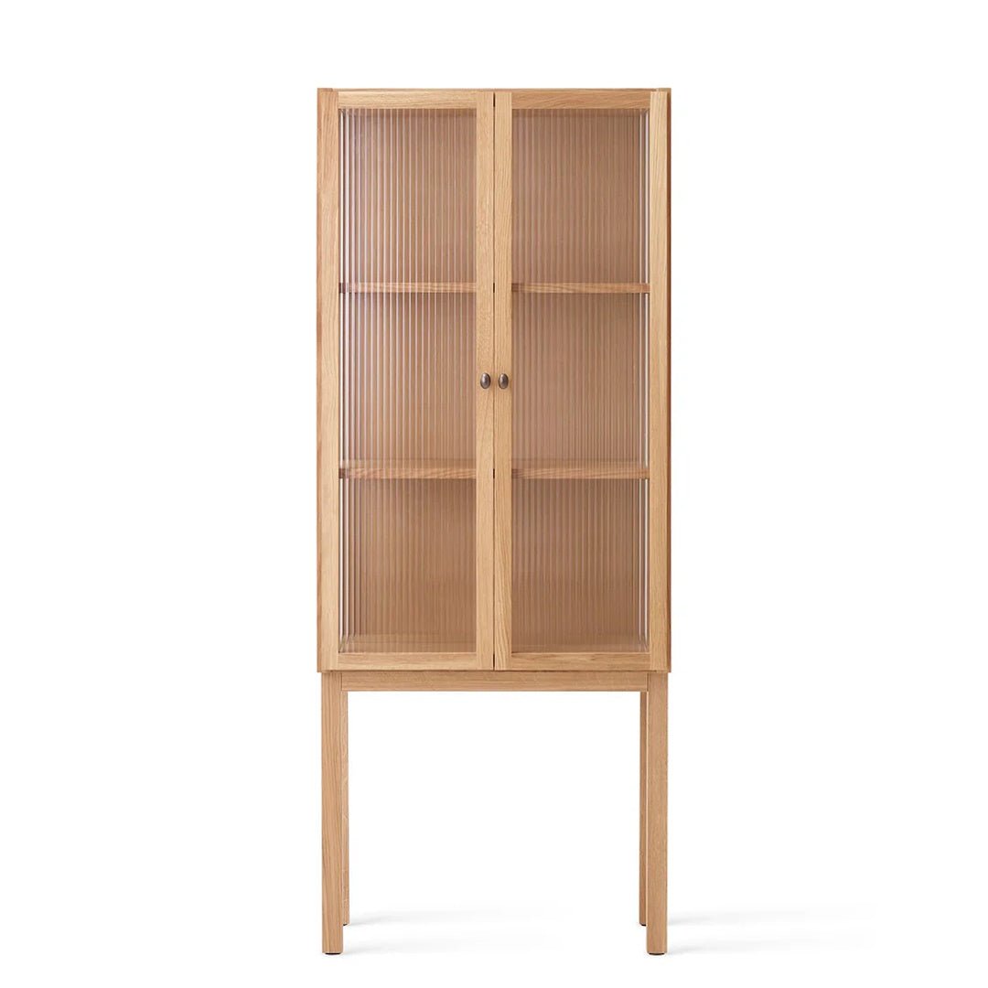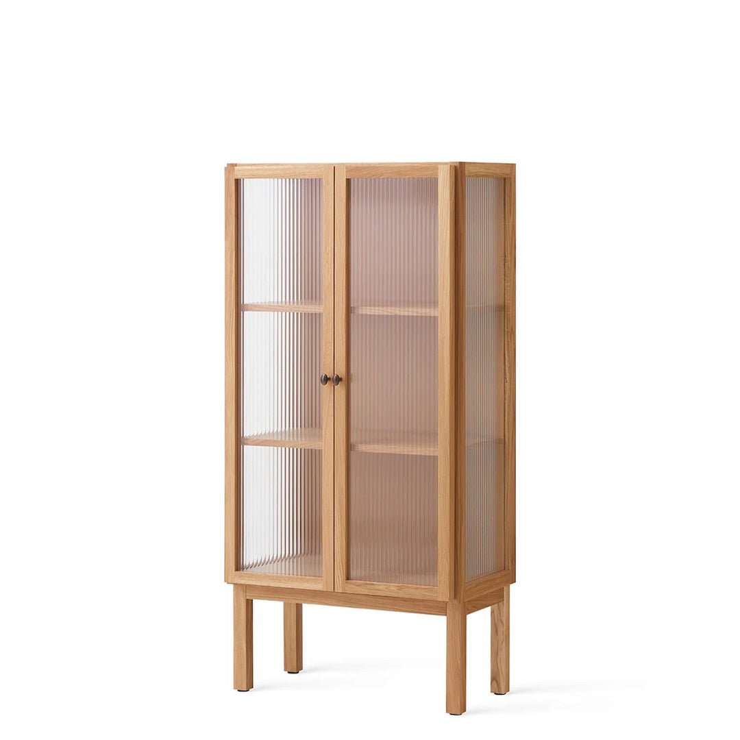 A beautiful and modern rendition of a timeless furniture piece, the Curiosity Cabinet is carefully crafted in solid oak using traditional joinery techniques. Designed to store objects almost out of sight thanks to its elegant reeded glass doors that gently blur the contents within, it opens to reveal two height adjustable oak veneer shelves for ample room to store your objects. Brass hinges and handles complete the design. Available in low and high versions.