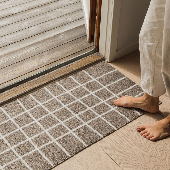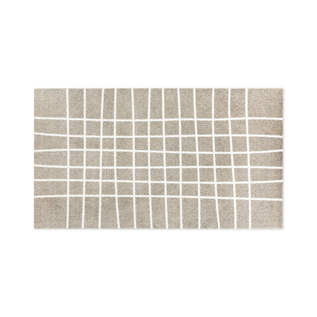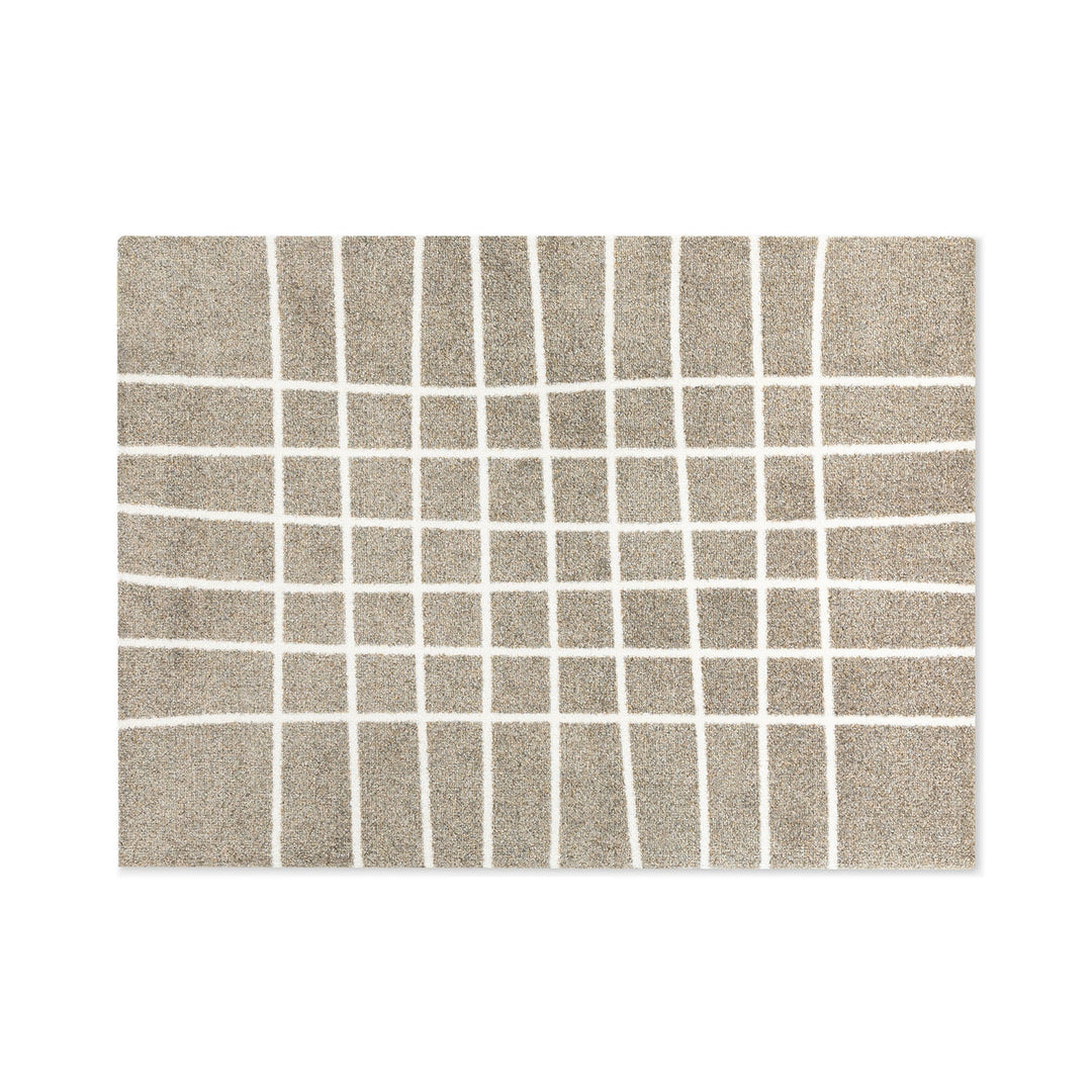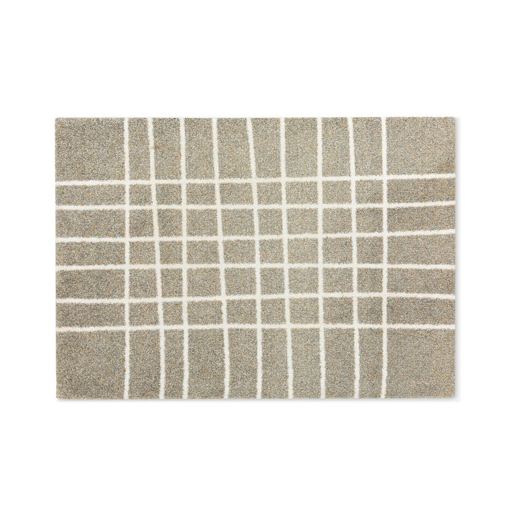 Hand Travertine features hand-drawn lines that contrast with the rigid, rectangular grid. The soft grey background and delicate white details pay homage to the limestone it is named after, making it a beautiful and elegant addition to any interior. Designed by Kristine Five Melvær
