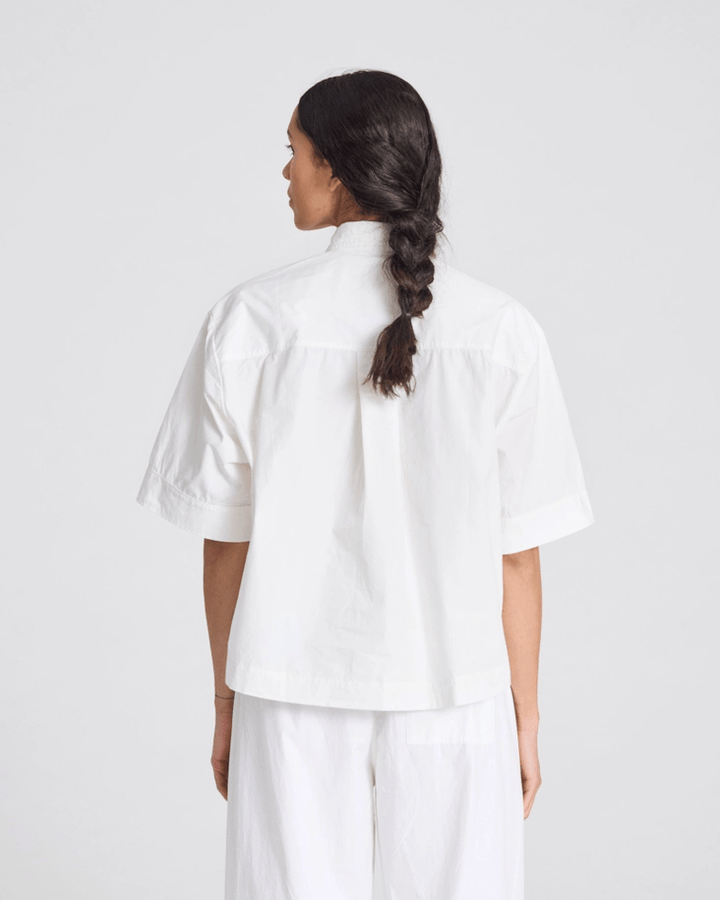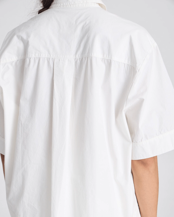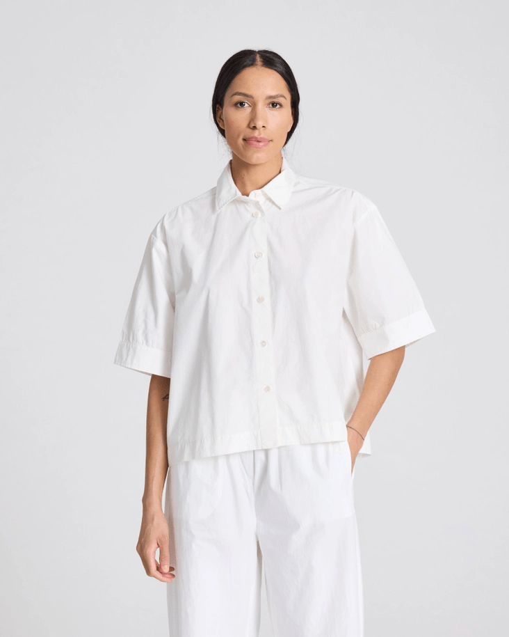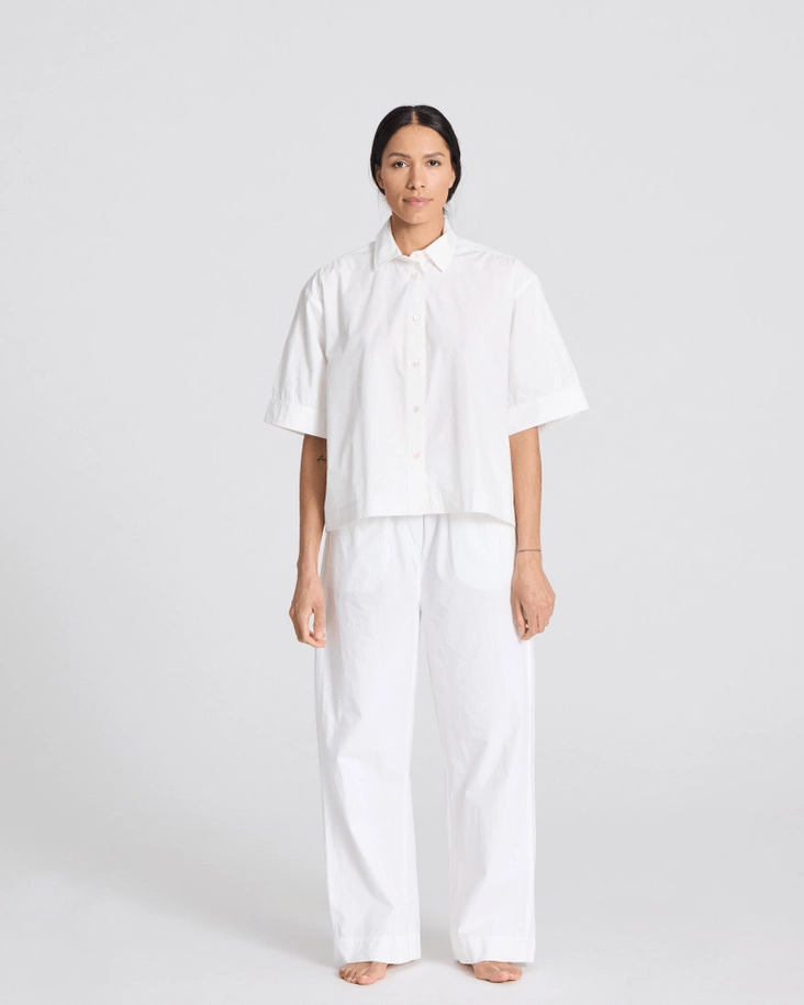 The Astrid Poplin Shirt features a cropped, oversized design crafted from 100% organic cotton with short sleeves and a button-down front. Distinguished by its pointy collar, mother of pearl buttons, and thoughtful details like dropped shoulders, cuffs, and a yoke center back. For the most flattering fit, we kindly suggest choosing one size smaller than your usual.